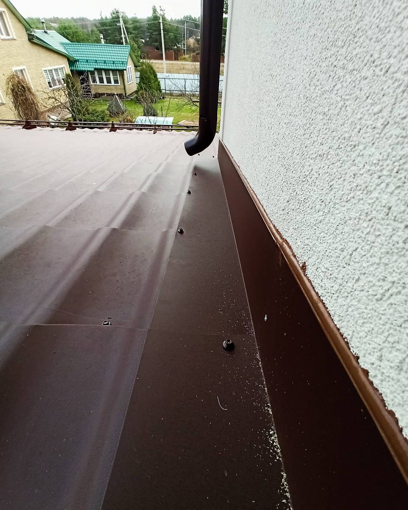 • Установка карнизных планок из металла в цвет кровли. Защиту краев обрешеточного бруса от воздействия внешней среды обеспечивают карнизные панели. Монтируются панели на подкладку внахлест с перекрытием на 20 мм и фиксируются гвоздями. Шаг крепления – 100 мм;